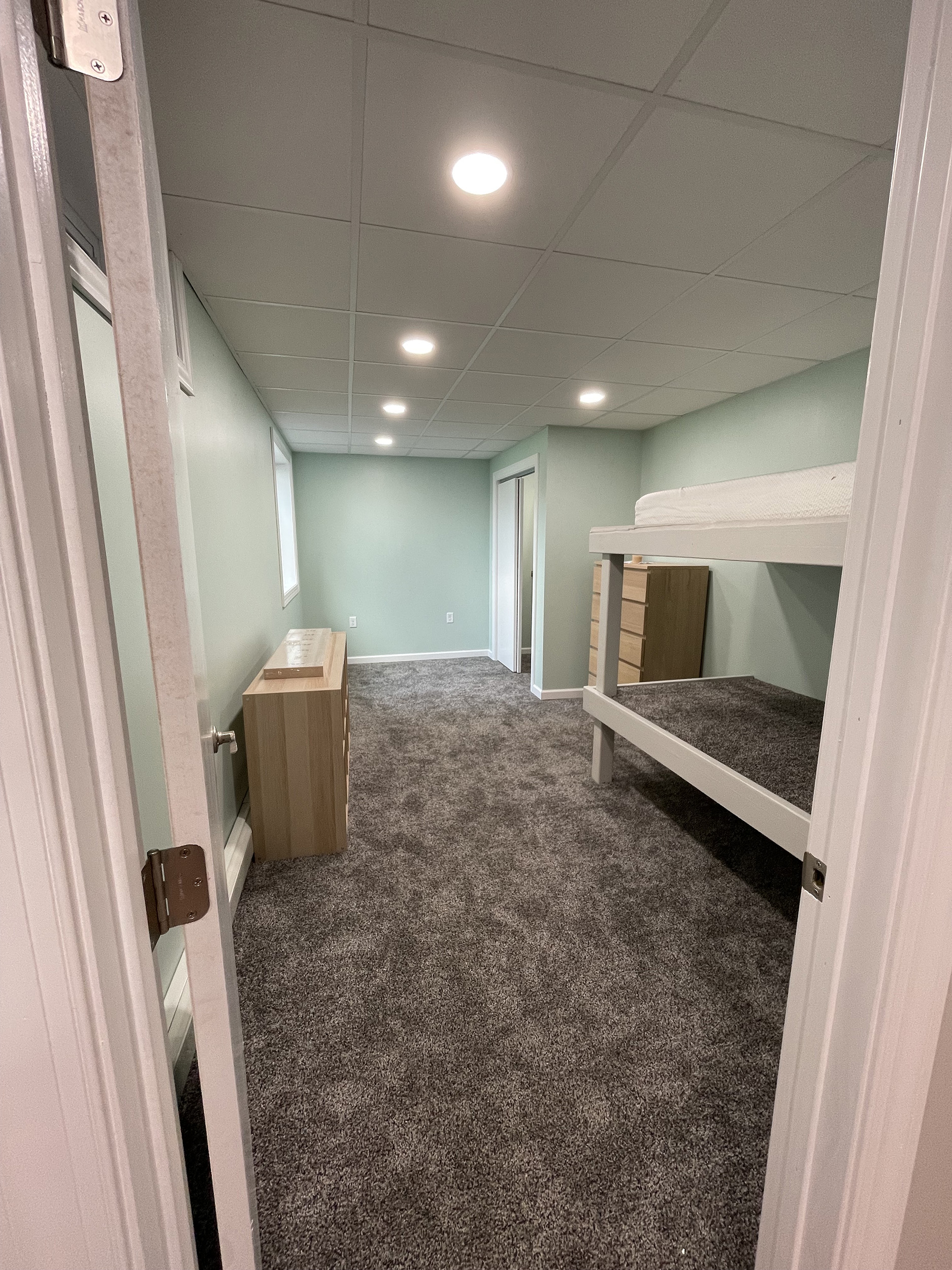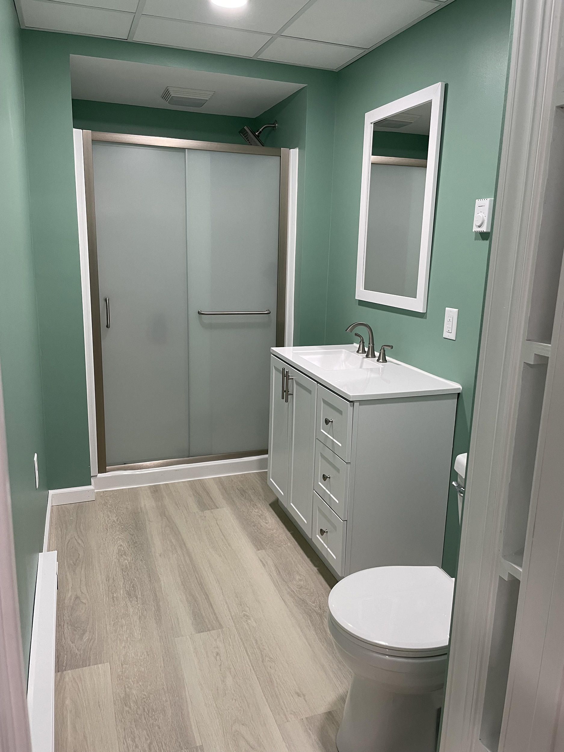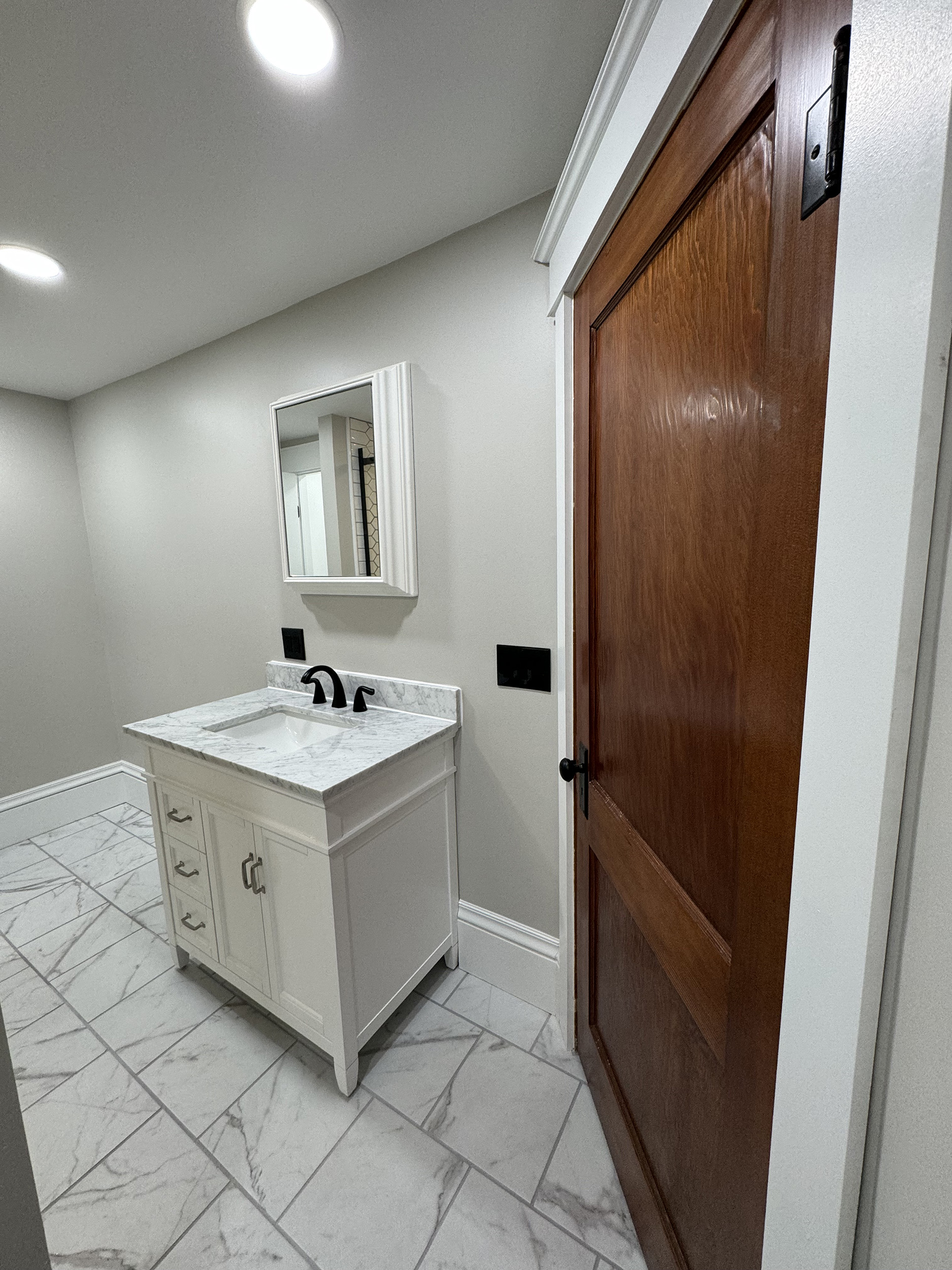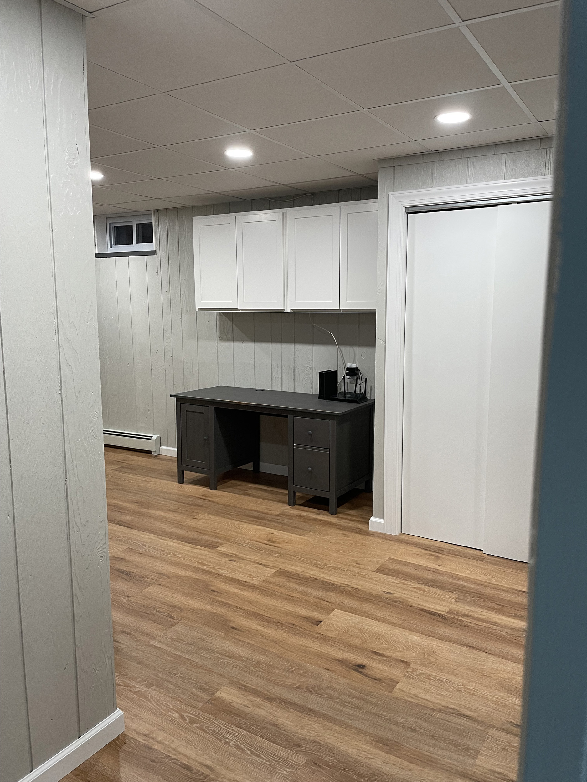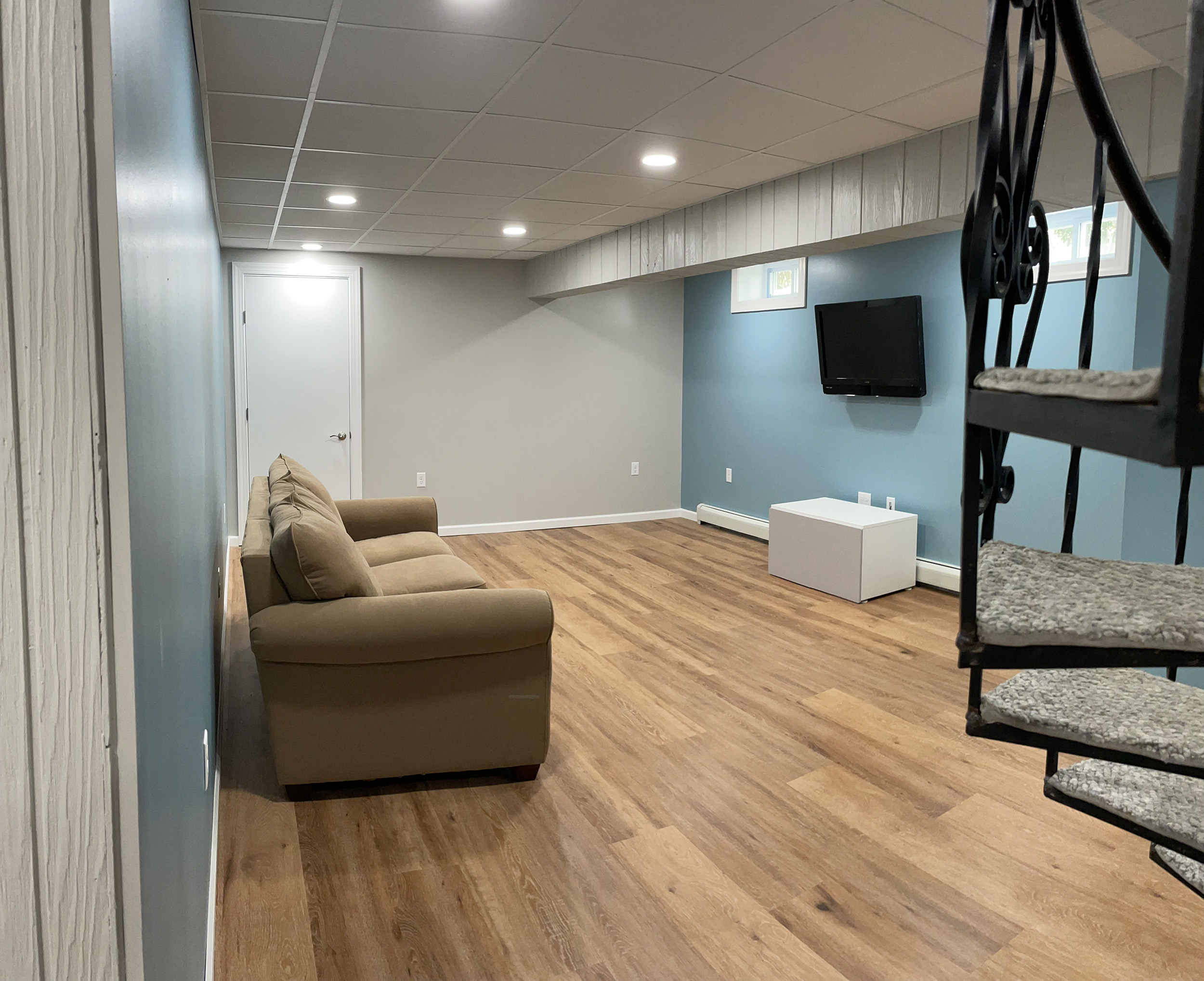 This scope of work was a complete gut and remodel. Partition walls were built to create a 250 sq. ft. bedroom with a custom closet. Within the bedroom, A 4’ x 4’ void was cut out of the foundation to make way for an egress window. The bathroom from the 60s was demoed and remodeled. LVT plank was installed in common areas throughout.