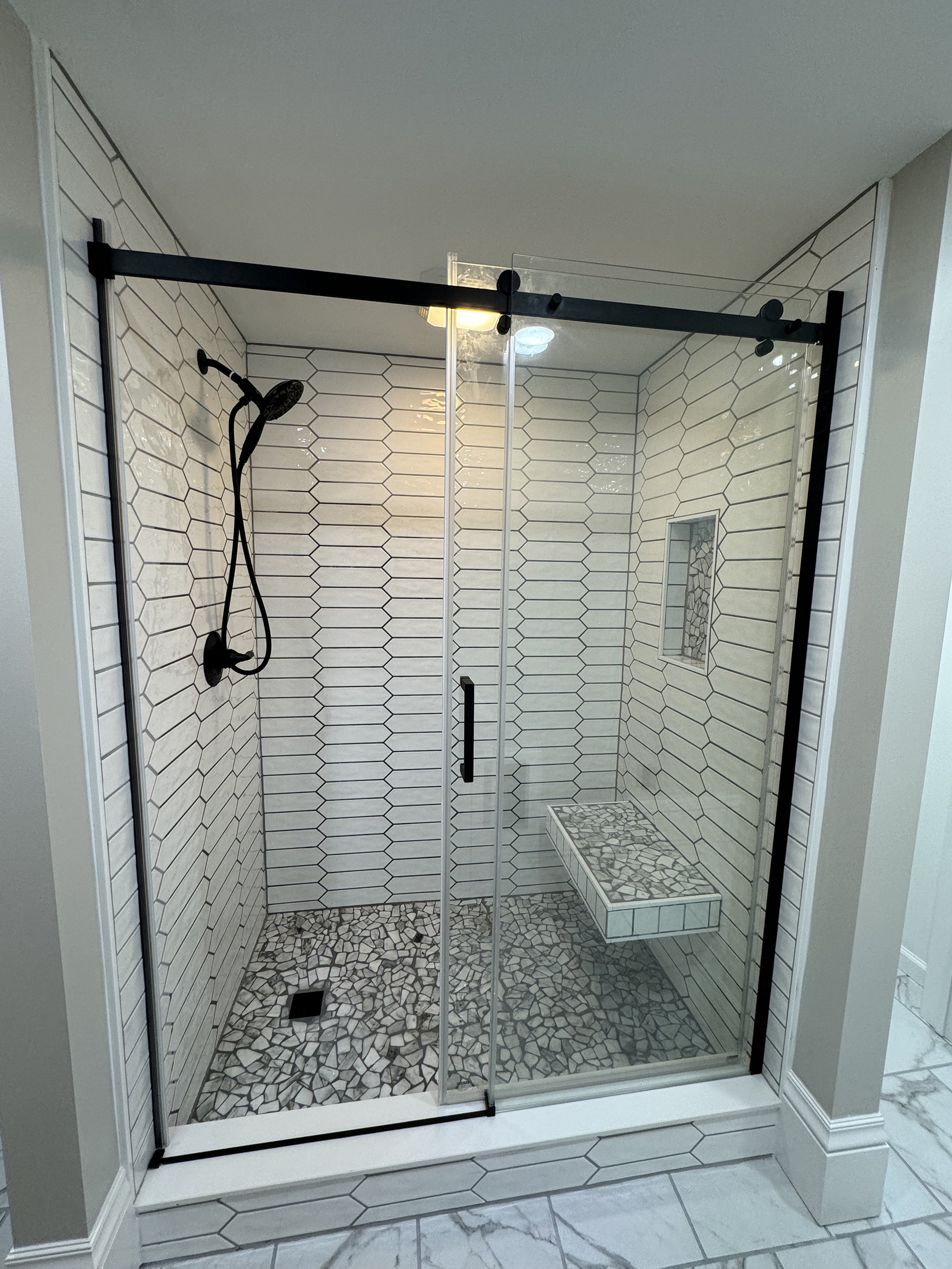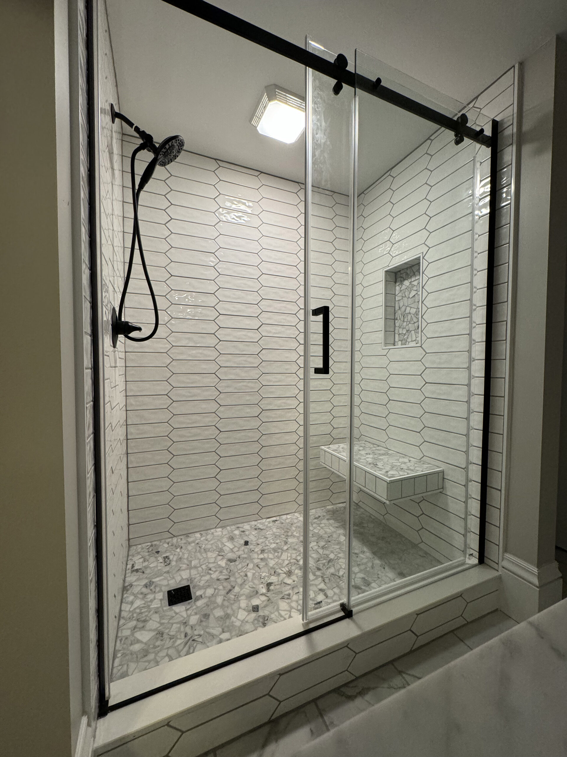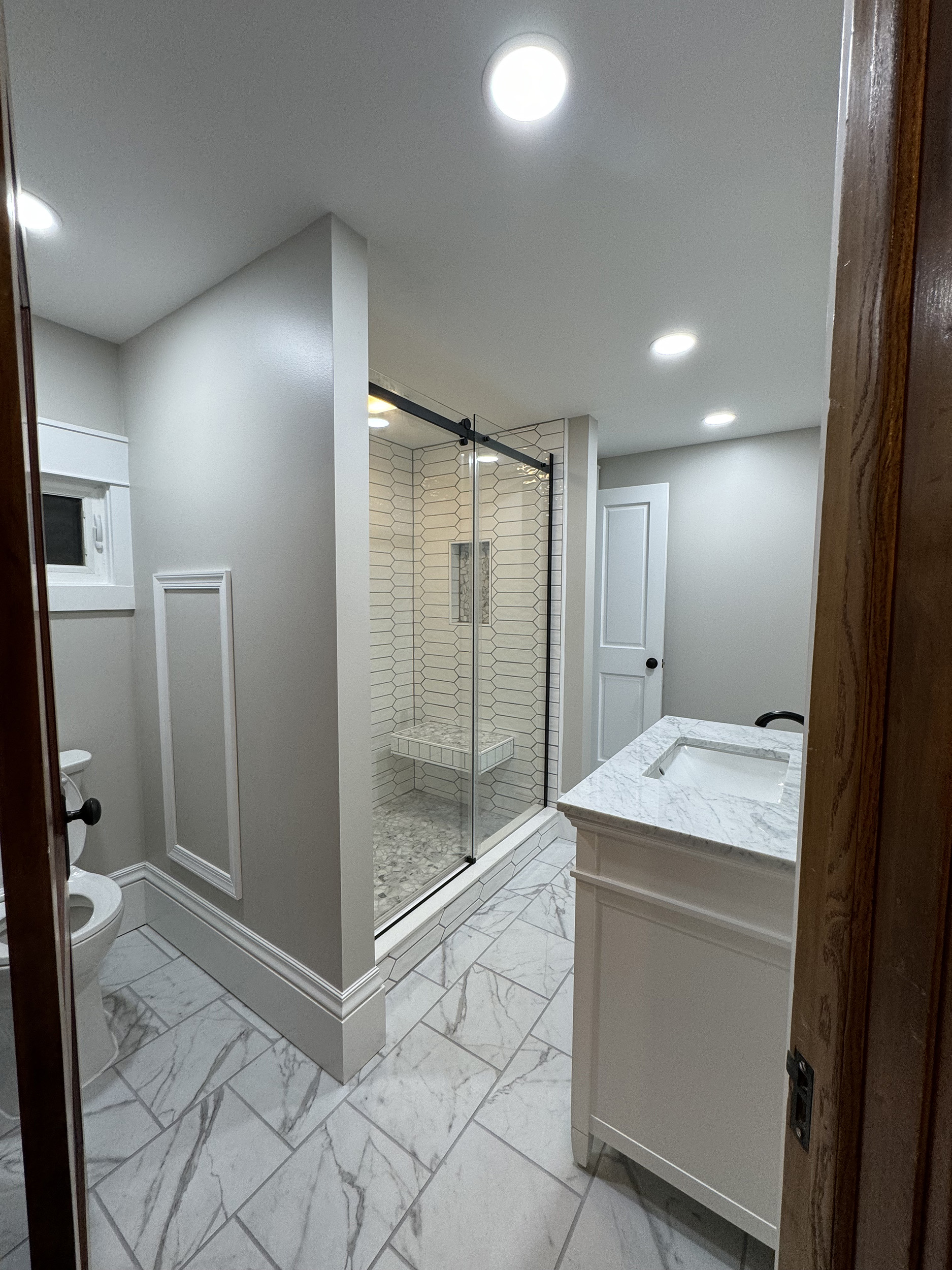 For this project, Faithful Contracting completed the remodel of a bathroom for a long-time family friend. The entire space was stripped to studs and renovated. The scope consisted of installing a walk-in shower, frosted glass shower doors, a diamond pattern ceramic tile floor & recessed lighting throughout, creating a fresh & new space to get ready for the day!